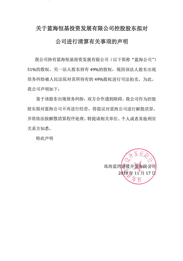 關(guān)于藍(lán)海恒基投資發(fā)展有限公司控股股東擬對(duì)公司進(jìn)行清算有關(guān)事項(xiàng)的聲明